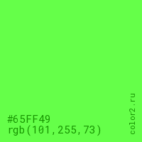 Цвет #65FF49 в цветовой модели RGB обозначается тремя октетами (101, 255, 73) в десятичном формате и #65FF49 в шестнадцатиричном (hex) формате, которые являются интенсивностью красного 101 (hex 65), интенсивность зелёного 255 (hex FF) и интенсивность синего 73 (hex 49).