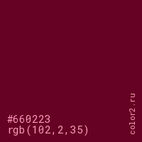 Цвет #660223 в цветовой модели RGB обозначается тремя октетами (102, 2, 35) в десятичном формате и #660223 в шестнадцатиричном (hex) формате, которые являются интенсивностью красного 102 (hex 66), интенсивность зелёного 2 (hex 02) и интенсивность синего 35 (hex 23).