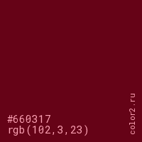 Цвет #660317 в цветовой модели RGB обозначается тремя октетами (102, 3, 23) в десятичном формате и #660317 в шестнадцатиричном (hex) формате, которые являются интенсивностью красного 102 (hex 66), интенсивность зелёного 3 (hex 03) и интенсивность синего 23 (hex 17).