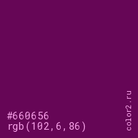 Цвет #660656 в цветовой модели RGB обозначается тремя октетами (102, 6, 86) в десятичном формате и #660656 в шестнадцатиричном (hex) формате, которые являются интенсивностью красного 102 (hex 66), интенсивность зелёного 6 (hex 06) и интенсивность синего 86 (hex 56).
