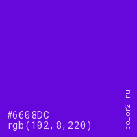 Цвет #6608DC в цветовой модели RGB обозначается тремя октетами (102, 8, 220) в десятичном формате и #6608DC в шестнадцатиричном (hex) формате, которые являются интенсивностью красного 102 (hex 66), интенсивность зелёного 8 (hex 08) и интенсивность синего 220 (hex DC).