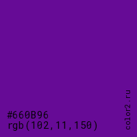 Цвет #660B96 в цветовой модели RGB обозначается тремя октетами (102, 11, 150) в десятичном формате и #660B96 в шестнадцатиричном (hex) формате, которые являются интенсивностью красного 102 (hex 66), интенсивность зелёного 11 (hex 0B) и интенсивность синего 150 (hex 96).