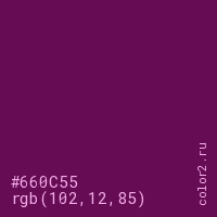 Цвет #660C55 в цветовой модели RGB обозначается тремя октетами (102, 12, 85) в десятичном формате и #660C55 в шестнадцатиричном (hex) формате, которые являются интенсивностью красного 102 (hex 66), интенсивность зелёного 12 (hex 0C) и интенсивность синего 85 (hex 55).
