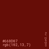 Цвет #660D07 в цветовой модели RGB обозначается тремя октетами (102, 13, 7) в десятичном формате и #660D07 в шестнадцатиричном (hex) формате, которые являются интенсивностью красного 102 (hex 66), интенсивность зелёного 13 (hex 0D) и интенсивность синего 7 (hex 07).