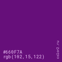 Цвет #660F7A в цветовой модели RGB обозначается тремя октетами (102, 15, 122) в десятичном формате и #660F7A в шестнадцатиричном (hex) формате, которые являются интенсивностью красного 102 (hex 66), интенсивность зелёного 15 (hex 0F) и интенсивность синего 122 (hex 7A).