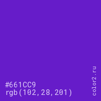Цвет #661CC9 в цветовой модели RGB обозначается тремя октетами (102, 28, 201) в десятичном формате и #661CC9 в шестнадцатиричном (hex) формате, которые являются интенсивностью красного 102 (hex 66), интенсивность зелёного 28 (hex 1C) и интенсивность синего 201 (hex C9).