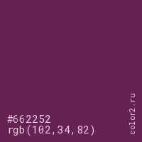 Цвет #662252 в цветовой модели RGB обозначается тремя октетами (102, 34, 82) в десятичном формате и #662252 в шестнадцатиричном (hex) формате, которые являются интенсивностью красного 102 (hex 66), интенсивность зелёного 34 (hex 22) и интенсивность синего 82 (hex 52).