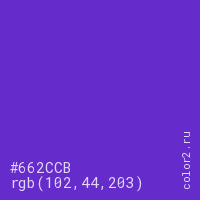 Цвет #662CCB в цветовой модели RGB обозначается тремя октетами (102, 44, 203) в десятичном формате и #662CCB в шестнадцатиричном (hex) формате, которые являются интенсивностью красного 102 (hex 66), интенсивность зелёного 44 (hex 2C) и интенсивность синего 203 (hex CB).