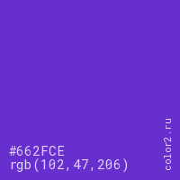 Цвет #662FCE в цветовой модели RGB обозначается тремя октетами (102, 47, 206) в десятичном формате и #662FCE в шестнадцатиричном (hex) формате, которые являются интенсивностью красного 102 (hex 66), интенсивность зелёного 47 (hex 2F) и интенсивность синего 206 (hex CE).