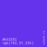 Цвет #6633EC в цветовой модели RGB обозначается тремя октетами (102, 51, 236) в десятичном формате и #6633EC в шестнадцатиричном (hex) формате, которые являются интенсивностью красного 102 (hex 66), интенсивность зелёного 51 (hex 33) и интенсивность синего 236 (hex EC).
