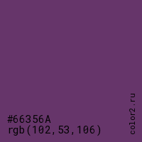 Цвет #66356A в цветовой модели RGB обозначается тремя октетами (102, 53, 106) в десятичном формате и #66356A в шестнадцатиричном (hex) формате, которые являются интенсивностью красного 102 (hex 66), интенсивность зелёного 53 (hex 35) и интенсивность синего 106 (hex 6A).