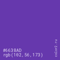 Цвет #6638AD в цветовой модели RGB обозначается тремя октетами (102, 56, 173) в десятичном формате и #6638AD в шестнадцатиричном (hex) формате, которые являются интенсивностью красного 102 (hex 66), интенсивность зелёного 56 (hex 38) и интенсивность синего 173 (hex AD).