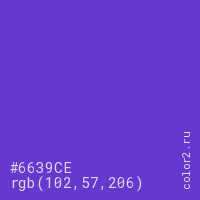 Цвет #6639CE в цветовой модели RGB обозначается тремя октетами (102, 57, 206) в десятичном формате и #6639CE в шестнадцатиричном (hex) формате, которые являются интенсивностью красного 102 (hex 66), интенсивность зелёного 57 (hex 39) и интенсивность синего 206 (hex CE).