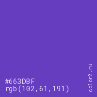 Цвет #663DBF в цветовой модели RGB обозначается тремя октетами (102, 61, 191) в десятичном формате и #663DBF в шестнадцатиричном (hex) формате, которые являются интенсивностью красного 102 (hex 66), интенсивность зелёного 61 (hex 3D) и интенсивность синего 191 (hex BF).