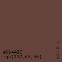 Цвет #66443C в цветовой модели RGB обозначается тремя октетами (102, 68, 60) в десятичном формате и #66443C в шестнадцатиричном (hex) формате, которые являются интенсивностью красного 102 (hex 66), интенсивность зелёного 68 (hex 44) и интенсивность синего 60 (hex 3C).