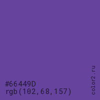 Цвет #66449D в цветовой модели RGB обозначается тремя октетами (102, 68, 157) в десятичном формате и #66449D в шестнадцатиричном (hex) формате, которые являются интенсивностью красного 102 (hex 66), интенсивность зелёного 68 (hex 44) и интенсивность синего 157 (hex 9D).