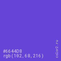 Цвет #6644D8 в цветовой модели RGB обозначается тремя октетами (102, 68, 216) в десятичном формате и #6644D8 в шестнадцатиричном (hex) формате, которые являются интенсивностью красного 102 (hex 66), интенсивность зелёного 68 (hex 44) и интенсивность синего 216 (hex D8).