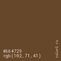 Цвет #664729 в цветовой модели RGB обозначается тремя октетами (102, 71, 41) в десятичном формате и #664729 в шестнадцатиричном (hex) формате, которые являются интенсивностью красного 102 (hex 66), интенсивность зелёного 71 (hex 47) и интенсивность синего 41 (hex 29).