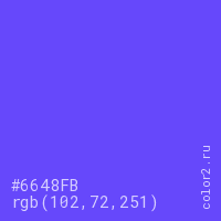Цвет #6648FB в цветовой модели RGB обозначается тремя октетами (102, 72, 251) в десятичном формате и #6648FB в шестнадцатиричном (hex) формате, которые являются интенсивностью красного 102 (hex 66), интенсивность зелёного 72 (hex 48) и интенсивность синего 251 (hex FB).