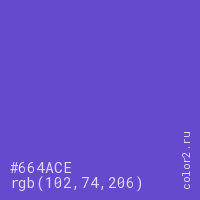 Цвет #664ACE в цветовой модели RGB обозначается тремя октетами (102, 74, 206) в десятичном формате и #664ACE в шестнадцатиричном (hex) формате, которые являются интенсивностью красного 102 (hex 66), интенсивность зелёного 74 (hex 4A) и интенсивность синего 206 (hex CE).