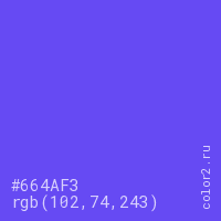 Цвет #664AF3 в цветовой модели RGB обозначается тремя октетами (102, 74, 243) в десятичном формате и #664AF3 в шестнадцатиричном (hex) формате, которые являются интенсивностью красного 102 (hex 66), интенсивность зелёного 74 (hex 4A) и интенсивность синего 243 (hex F3).
