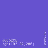 Цвет #6652CE в цветовой модели RGB обозначается тремя октетами (102, 82, 206) в десятичном формате и #6652CE в шестнадцатиричном (hex) формате, которые являются интенсивностью красного 102 (hex 66), интенсивность зелёного 82 (hex 52) и интенсивность синего 206 (hex CE).