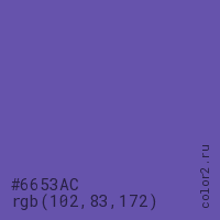 Цвет #6653AC в цветовой модели RGB обозначается тремя октетами (102, 83, 172) в десятичном формате и #6653AC в шестнадцатиричном (hex) формате, которые являются интенсивностью красного 102 (hex 66), интенсивность зелёного 83 (hex 53) и интенсивность синего 172 (hex AC).