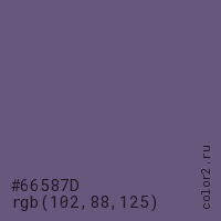 Цвет #66587D в цветовой модели RGB обозначается тремя октетами (102, 88, 125) в десятичном формате и #66587D в шестнадцатиричном (hex) формате, которые являются интенсивностью красного 102 (hex 66), интенсивность зелёного 88 (hex 58) и интенсивность синего 125 (hex 7D).