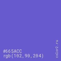 Цвет #665ACC в цветовой модели RGB обозначается тремя октетами (102, 90, 204) в десятичном формате и #665ACC в шестнадцатиричном (hex) формате, которые являются интенсивностью красного 102 (hex 66), интенсивность зелёного 90 (hex 5A) и интенсивность синего 204 (hex CC).