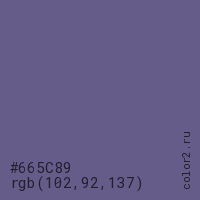 Цвет #665C89 в цветовой модели RGB обозначается тремя октетами (102, 92, 137) в десятичном формате и #665C89 в шестнадцатиричном (hex) формате, которые являются интенсивностью красного 102 (hex 66), интенсивность зелёного 92 (hex 5C) и интенсивность синего 137 (hex 89).