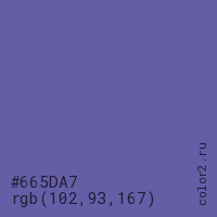 Цвет #665DA7 в цветовой модели RGB обозначается тремя октетами (102, 93, 167) в десятичном формате и #665DA7 в шестнадцатиричном (hex) формате, которые являются интенсивностью красного 102 (hex 66), интенсивность зелёного 93 (hex 5D) и интенсивность синего 167 (hex A7).