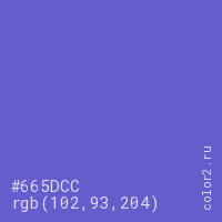 Цвет #665DCC в цветовой модели RGB обозначается тремя октетами (102, 93, 204) в десятичном формате и #665DCC в шестнадцатиричном (hex) формате, которые являются интенсивностью красного 102 (hex 66), интенсивность зелёного 93 (hex 5D) и интенсивность синего 204 (hex CC).