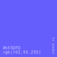 Цвет #665DFD в цветовой модели RGB обозначается тремя октетами (102, 93, 253) в десятичном формате и #665DFD в шестнадцатиричном (hex) формате, которые являются интенсивностью красного 102 (hex 66), интенсивность зелёного 93 (hex 5D) и интенсивность синего 253 (hex FD).