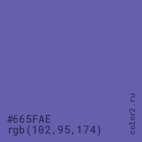Цвет #665FAE в цветовой модели RGB обозначается тремя октетами (102, 95, 174) в десятичном формате и #665FAE в шестнадцатиричном (hex) формате, которые являются интенсивностью красного 102 (hex 66), интенсивность зелёного 95 (hex 5F) и интенсивность синего 174 (hex AE).