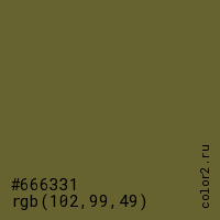Цвет #666331 в цветовой модели RGB обозначается тремя октетами (102, 99, 49) в десятичном формате и #666331 в шестнадцатиричном (hex) формате, которые являются интенсивностью красного 102 (hex 66), интенсивность зелёного 99 (hex 63) и интенсивность синего 49 (hex 31).