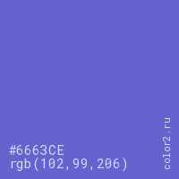 Цвет #6663CE в цветовой модели RGB обозначается тремя октетами (102, 99, 206) в десятичном формате и #6663CE в шестнадцатиричном (hex) формате, которые являются интенсивностью красного 102 (hex 66), интенсивность зелёного 99 (hex 63) и интенсивность синего 206 (hex CE).