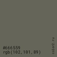 Цвет #666559 в цветовой модели RGB обозначается тремя октетами (102, 101, 89) в десятичном формате и #666559 в шестнадцатиричном (hex) формате, которые являются интенсивностью красного 102 (hex 66), интенсивность зелёного 101 (hex 65) и интенсивность синего 89 (hex 59).