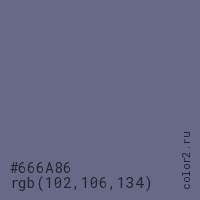 Цвет #666A86 в цветовой модели RGB обозначается тремя октетами (102, 106, 134) в десятичном формате и #666A86 в шестнадцатиричном (hex) формате, которые являются интенсивностью красного 102 (hex 66), интенсивность зелёного 106 (hex 6A) и интенсивность синего 134 (hex 86).