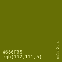 Цвет #666F05 в цветовой модели RGB обозначается тремя октетами (102, 111, 5) в десятичном формате и #666F05 в шестнадцатиричном (hex) формате, которые являются интенсивностью красного 102 (hex 66), интенсивность зелёного 111 (hex 6F) и интенсивность синего 5 (hex 05).