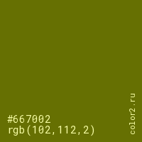Цвет #667002 в цветовой модели RGB обозначается тремя октетами (102, 112, 2) в десятичном формате и #667002 в шестнадцатиричном (hex) формате, которые являются интенсивностью красного 102 (hex 66), интенсивность зелёного 112 (hex 70) и интенсивность синего 2 (hex 02).