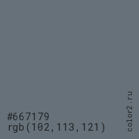 Цвет #667179 в цветовой модели RGB обозначается тремя октетами (102, 113, 121) в десятичном формате и #667179 в шестнадцатиричном (hex) формате, которые являются интенсивностью красного 102 (hex 66), интенсивность зелёного 113 (hex 71) и интенсивность синего 121 (hex 79).