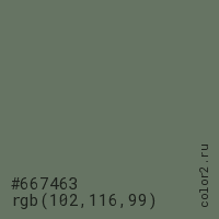 Цвет #667463 в цветовой модели RGB обозначается тремя октетами (102, 116, 99) в десятичном формате и #667463 в шестнадцатиричном (hex) формате, которые являются интенсивностью красного 102 (hex 66), интенсивность зелёного 116 (hex 74) и интенсивность синего 99 (hex 63).