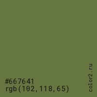 Цвет #667641 в цветовой модели RGB обозначается тремя октетами (102, 118, 65) в десятичном формате и #667641 в шестнадцатиричном (hex) формате, которые являются интенсивностью красного 102 (hex 66), интенсивность зелёного 118 (hex 76) и интенсивность синего 65 (hex 41).