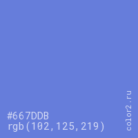 Цвет #667DDB в цветовой модели RGB обозначается тремя октетами (102, 125, 219) в десятичном формате и #667DDB в шестнадцатиричном (hex) формате, которые являются интенсивностью красного 102 (hex 66), интенсивность зелёного 125 (hex 7D) и интенсивность синего 219 (hex DB).