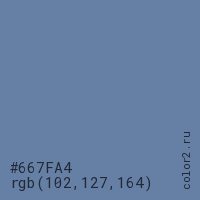 Цвет #667FA4 в цветовой модели RGB обозначается тремя октетами (102, 127, 164) в десятичном формате и #667FA4 в шестнадцатиричном (hex) формате, которые являются интенсивностью красного 102 (hex 66), интенсивность зелёного 127 (hex 7F) и интенсивность синего 164 (hex A4).