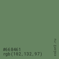 Цвет #668461 в цветовой модели RGB обозначается тремя октетами (102, 132, 97) в десятичном формате и #668461 в шестнадцатиричном (hex) формате, которые являются интенсивностью красного 102 (hex 66), интенсивность зелёного 132 (hex 84) и интенсивность синего 97 (hex 61).