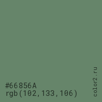 Цвет #66856A в цветовой модели RGB обозначается тремя октетами (102, 133, 106) в десятичном формате и #66856A в шестнадцатиричном (hex) формате, которые являются интенсивностью красного 102 (hex 66), интенсивность зелёного 133 (hex 85) и интенсивность синего 106 (hex 6A).