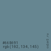 Цвет #668691 в цветовой модели RGB обозначается тремя октетами (102, 134, 145) в десятичном формате и #668691 в шестнадцатиричном (hex) формате, которые являются интенсивностью красного 102 (hex 66), интенсивность зелёного 134 (hex 86) и интенсивность синего 145 (hex 91).