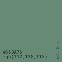 Цвет #668A76 в цветовой модели RGB обозначается тремя октетами (102, 138, 118) в десятичном формате и #668A76 в шестнадцатиричном (hex) формате, которые являются интенсивностью красного 102 (hex 66), интенсивность зелёного 138 (hex 8A) и интенсивность синего 118 (hex 76).