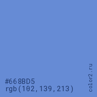 Цвет #668BD5 в цветовой модели RGB обозначается тремя октетами (102, 139, 213) в десятичном формате и #668BD5 в шестнадцатиричном (hex) формате, которые являются интенсивностью красного 102 (hex 66), интенсивность зелёного 139 (hex 8B) и интенсивность синего 213 (hex D5).